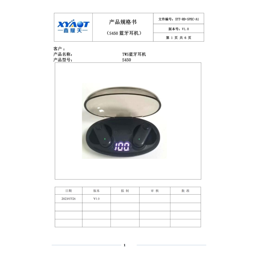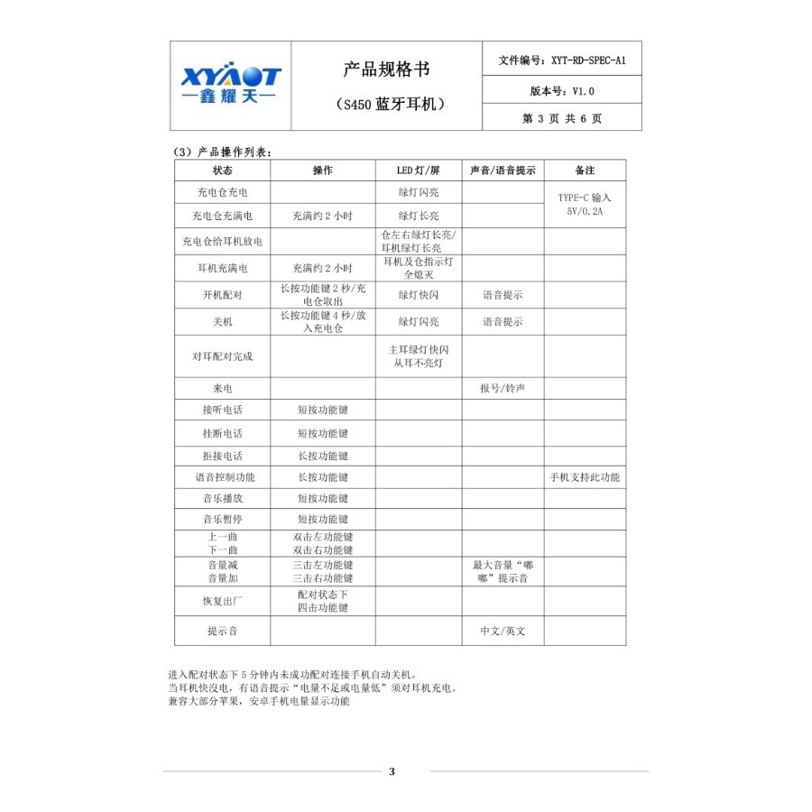Usage time: standby time of about 60 hours, listening to music for about 3.5 hours, and talking for about 3.5 hours;